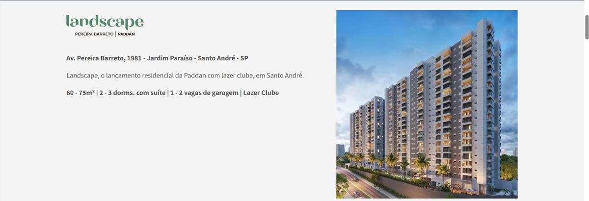 Bem-vindo ao Landscape by Paddan, o lançamento que redefine o conceito de morar bem em Santo André. Imagine ter o luxo e o conforto de um resort à sua porta, todos os dias. Um lugar onde cada detalhe foi pensado para elevar sua qualidade de vida e proporcionar momentos inesquecíveis para você e sua família.